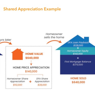 Instead of monthly payments, this assistance is structured as a shared appreciation loan. That means repayment is deferred until the home is sold, refinanced, or transferred, at which point the buyer repays: