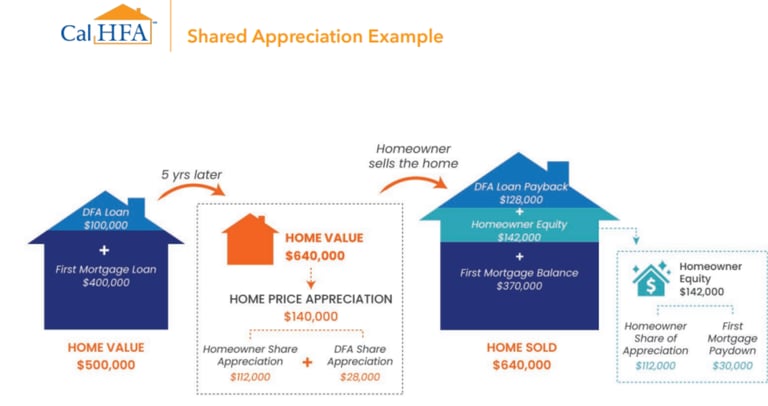 The California Dream For All Shared Appreciation Loan is a program administered by CalHFA (California Housing Finance Agency). It provides qualified buyers with down payment and closing cost assistance of up to: